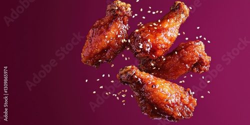 Korean-style crispy fried chicken with sticky gochujang sauce and sesame seeds mid-air on a deep magenta backdrop