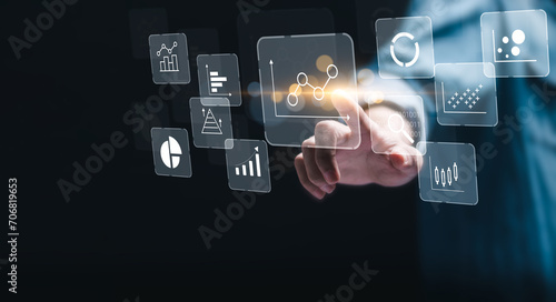 KPI Business analytics concept. Businessman touch virtual screen of data analytics report and key performance indicators on information dashboard for business strategy and business intelligence.