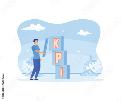 KPI, key performance indicator measurement to evaluate success or meet target, metric or data to review and improve business concept. flat vector modern illustration