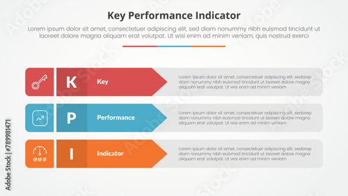 KPI key performance indicator model infographic concept for slide presentation with rectangle arrow stack with 3 point list with flat style