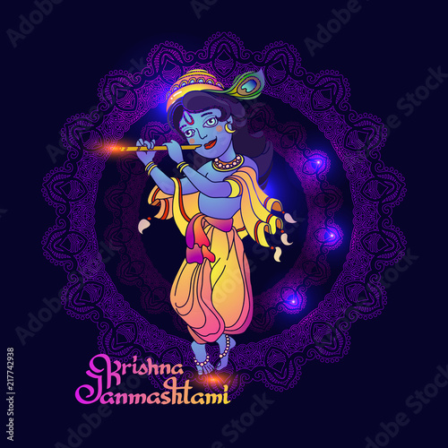 Krishna Janmashtami greeting card. Vector. Young Lord Krishna.