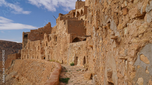 Ksar Chenini,governatorato di Tataouine, Tunisia, resti del tipico villaggio fortificato Berbero composto da granai e abitazioni costruiti all'interno di un muro di cinta difensivo.Tatoaine, Tunisia