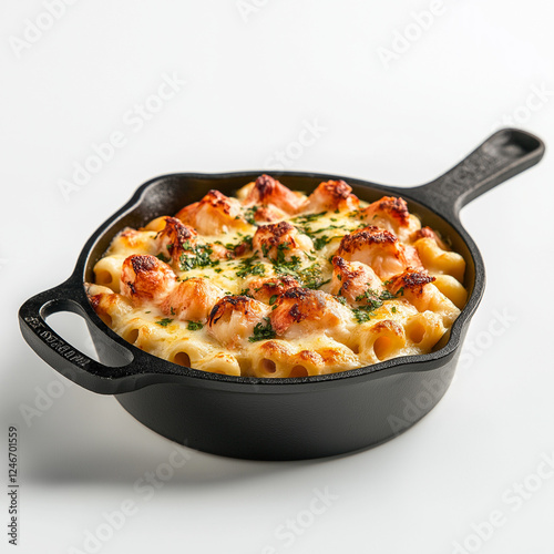 Käseüberbackene Pasta mit knusprigen Würstchen in Pfanne serviert