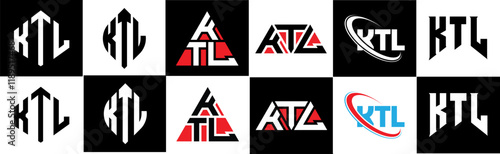 KTL letter logo design in six style. KTL polygon, circle, triangle, hexagon, flat and simple style with black and white color variation letter logo set in one artboard. KTL minimalist and classic logo