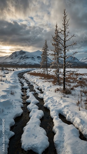 Kungsleden trail post-snowstorm in Lapland, Sweden.