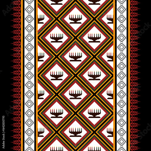 Kwanzaa Intricate geometric pattern with vibrant colors and a rich cultural motif. The design incorporates symmetrical elements.