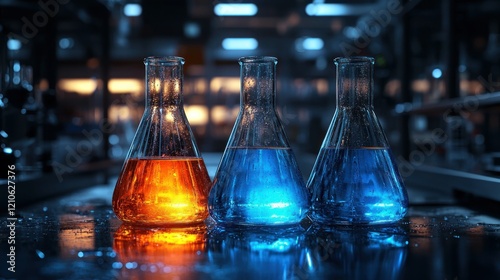 Lab Erlenmeyer flasks, liquids, research, science, glow, experiment, night, chemistry, background