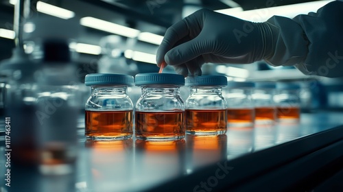 Lab Scientist Testing Amber Liquid Samples in Glass Jars