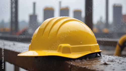 Labor day, yellow construction hard hat covered in raindrops and muddy stains, resting on a metal beam under rainy weather conditions with a blurred industrial background