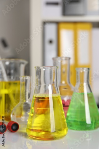 Laboratory analysis. Different glassware with liquids on white table indoors