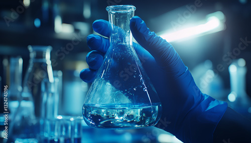 Laboratory beaker in analyst's hand in plastic glove