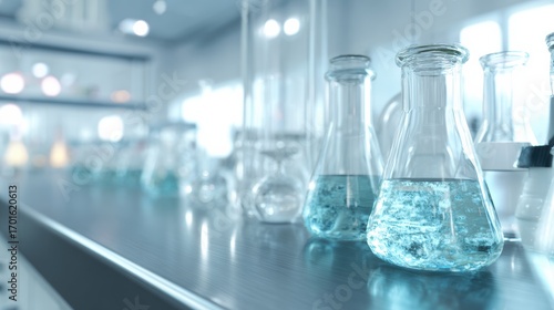 Laboratory equipment with glass flasks filled with blue liquid, creating a focused and innovative research environment.