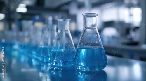 Laboratory Erlenmeyer Flasks with Blue Liquid in a Modern Lab Setting