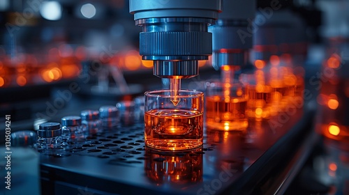 Laboratory Experiment with Microscope Analyzing Viscous Orange Liquid in Glass Vials in Bright Environment