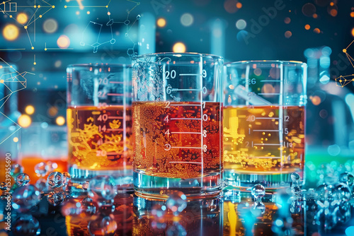 Laboratory glassware filled with colorful chemical liquids, double exposure with scientific research environment and chemical equations overlay, sharp and clear details