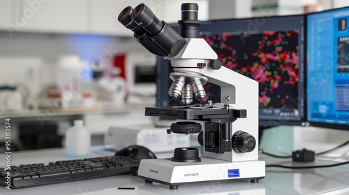 Laboratory Microscope with Computer Screens Displaying Scientific Data