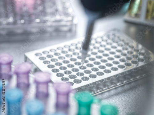Laboratory pipette placing liquid into a multiwell plate on a metallic surface.
