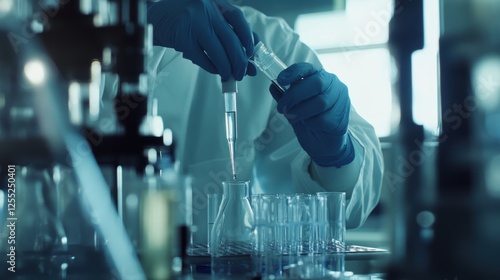 Laboratory research with scientist using pipette and glassware for chemical analysis, conducting experiments and implementing innovative solutions in biotech field.