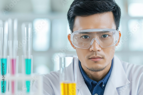 Laboratory Researcher Conducting Experiments with Test Tube, Donning Safety Goggles and Lab Coat for Safety and Precision