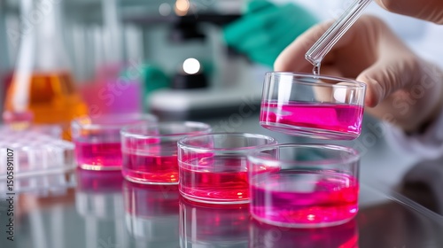 Laboratory technician conducts experiment with colorful liquids in glass containers during research work