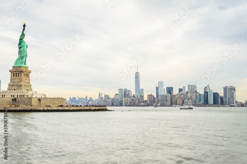 Lady Liberty Statue with Lower Manhattan Futuristic Buildings and Towers in Background . New York City, USA