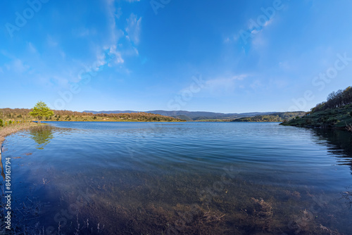 Lake landscape. Nature photo taken with fisheye lens. The water surface and the ground appear in the same frame. Bolu,Turkey.