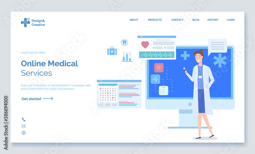 Landing page of medical website, online medical services, online help, medical consultation, support. Doctor, physician, therapist woman smiling, planning dates in calendar, medical web icons