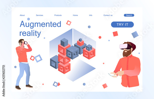 Landing page template of virtual augmented reality glasses concept with man learning and entertaining. Concept of web page design for website and mobile website. Vector illustration.