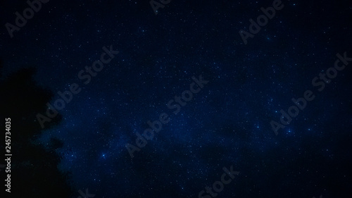 landscape and star concept from beautiful movement of star and milky way with blue background and tree foreground on autumn season