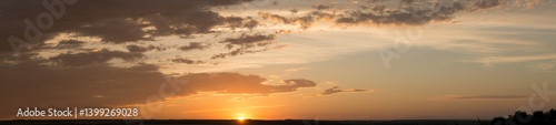 Landscape at sunset. Tragic gloomy sky. Panorama. Crimson twilight. Heavy, gloomy, dark clouds.