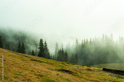 landscape forest and mountains in the mist silhouettes of peaks travel rest recovery in nature outdoors vacation in the Carpathians place for text yellow grass atmosphere wallpaper screensaver fog