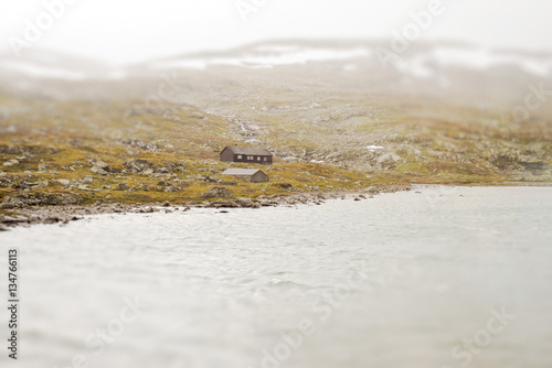 Landscape of Norway, mountains and shed, view from train