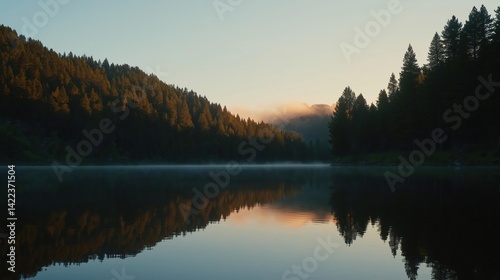 Landscape photograph of a lake surrounded by trees. the lake is calm and still, reflecting the trees and the sky.