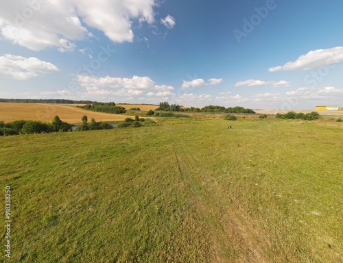 Landscape view from drone, yellow and green fields and haystacks, sky with white clouds.