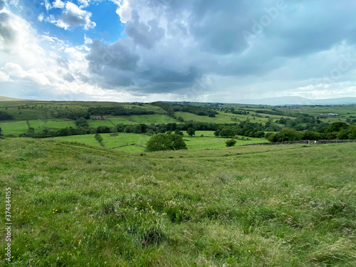 Landscape view, near Wycoller, with wild plants, fields, and meadows, and heavy rain clouds, near, Wycoller, Colne, UK
