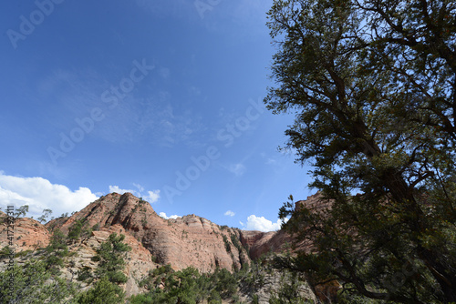 Landscape view of the cliffs and trees at Zion National Park on a sunny day