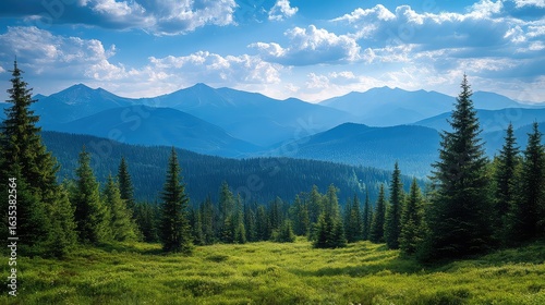 Landscape with a distant mountain range and coniferous forest. Nature background for hiking.