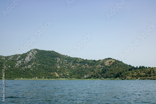 Landscape with lake and green mountains against the background of a clear sky. Panoramic beautiful view on largest lake. Wonderful summer day.
