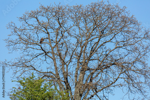 Landscape with Oak and Black Kite perched on its branches with buds in spring. Milvus migrans.