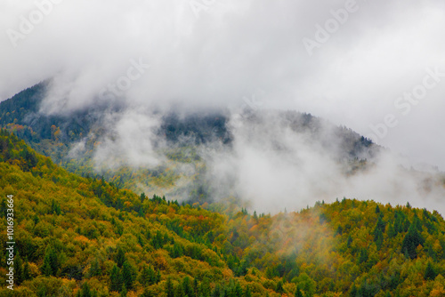 Landscape with steam above the forest in autumn