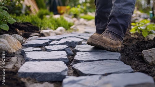 Landscaper installing a stone pathway in a garden. Featuring design and landscaping expertise