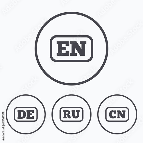 Language icons. EN, DE, RU and CN translation.