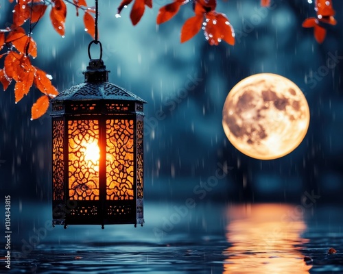 Lantern Glowing in Raindrops Under Moonlight with Red Leaves Background