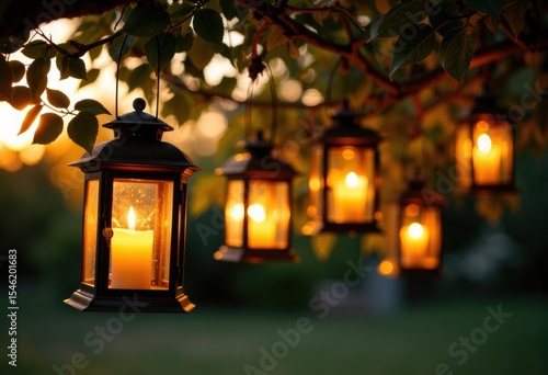 Lanterns with lit candles hanging from tree branches create a warm, inviting glow outdoors during sunset