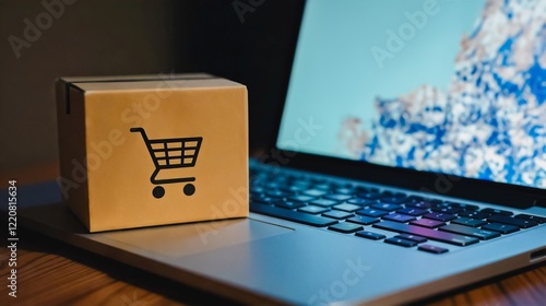 Laptop & Delivery Box, Close-up shot of a laptop computer with cardboard delivery box featuring a shopping cart icon.