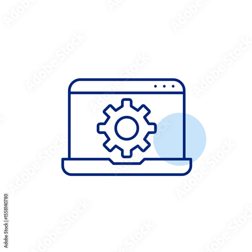 Laptop and cogwheel. System settings, automation tools, technical support, IT and administration. Pixel perfect, editable vector icon
