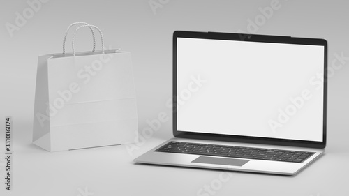 Laptop and Shopping bag mockup on white background. Business and online technology object concept. Empty screen display for insert your advertisement. 3D illustration rendering