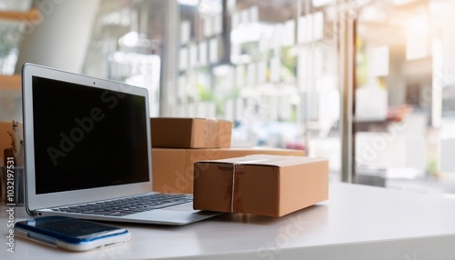laptop at work of a small start-up, surrounded by cardboard parcel boxes , generative ai