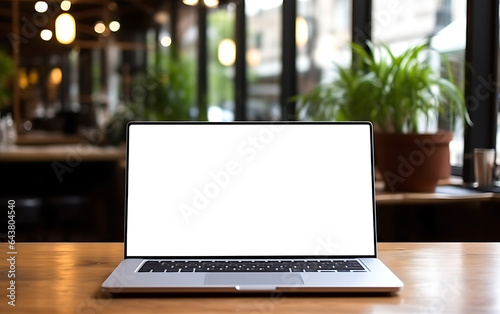 Laptop blank screen on table in cafe, remote work or freelancing concept