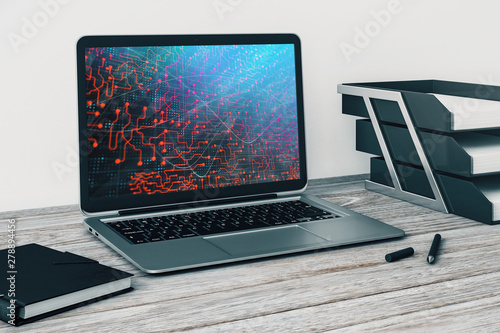 Laptop closeup with abstract tech drawing on computer screen. Technology innovation concept. 3d rendering.